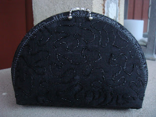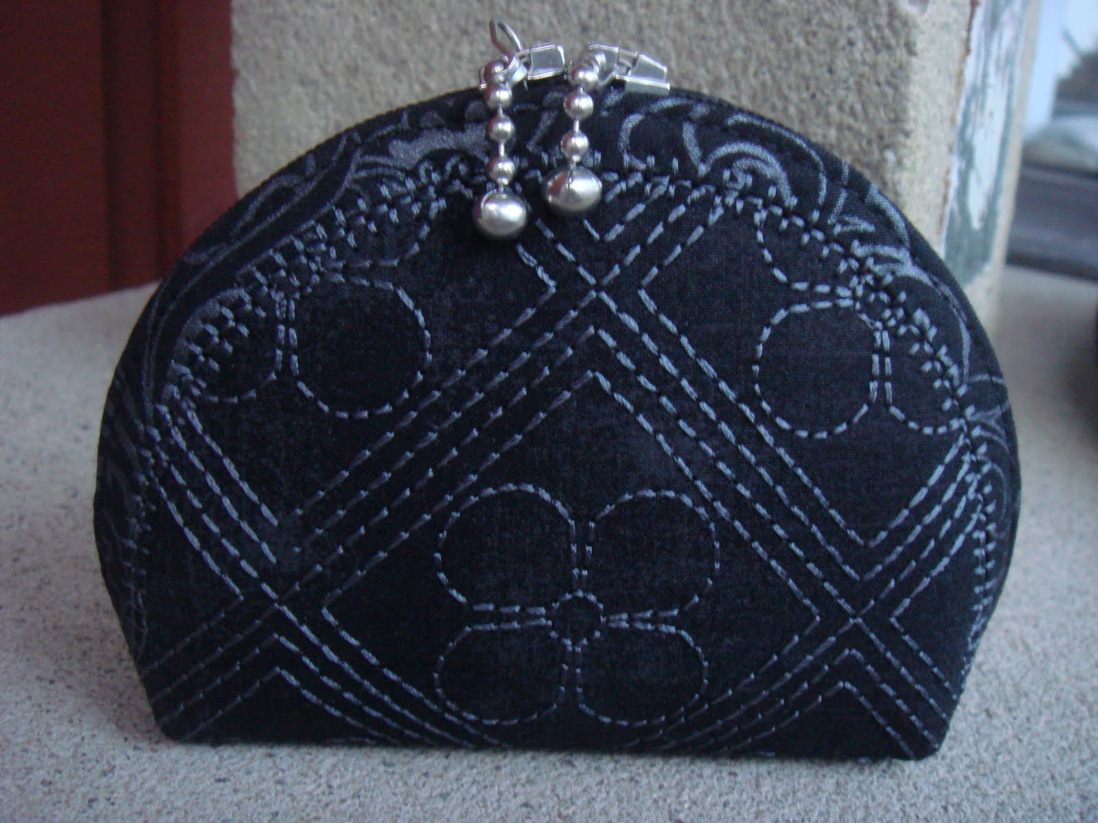 Jag började med att brodera ett maskinbroderi över ett helt tygstycke som fick bli till minsta necessären, på mellanstora gjorde jag en liten remsa enligt paper-piecing metod (så som mönstret föreskriver fast lite mindre arbetat på min). Den stora necessären prydde jag med frihandskviltning som blev extra effektfull med hjälp av ett glansigt svart garn som följer hela sömmen, där hade jag ett skojigt tillbehör till symaskinen, en frihandskviltningsfot med ett hål där det kan följa med ett garn som dekoration (finns bl.a. till Pfaff Expression 4.0)