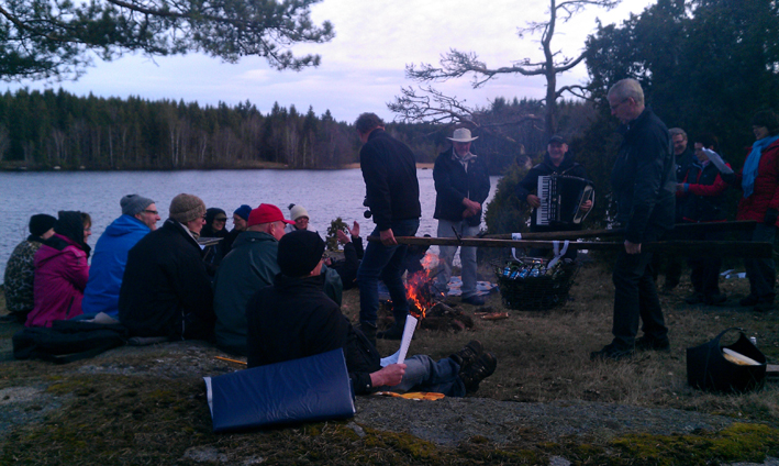 Tipspromenad i lapptäcksprydd skog på vår vandring till sjön där det blev allsång på berget, kan det bli bättre?