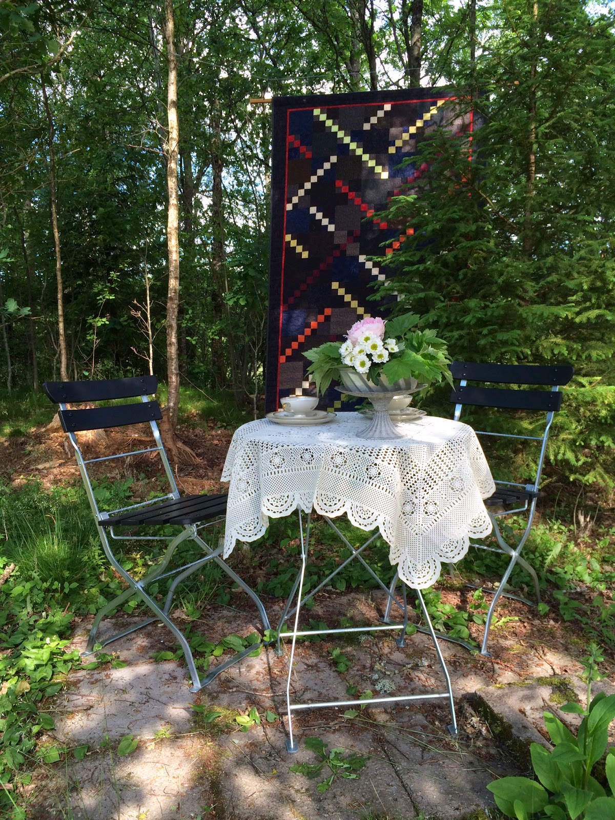 Nu har vi gjort dag ett av tre. Massor av täcken både här och på logen har beskådats av människor från hela södra Sverige och även flera från Tyskland. Det är kul möten med alla som kommer, flera har berättat att de lagt om sina semesterplaner och resrutter, förlängt sina vistelser i Sverige för att få komma på utställningen. Det är väl skoj!