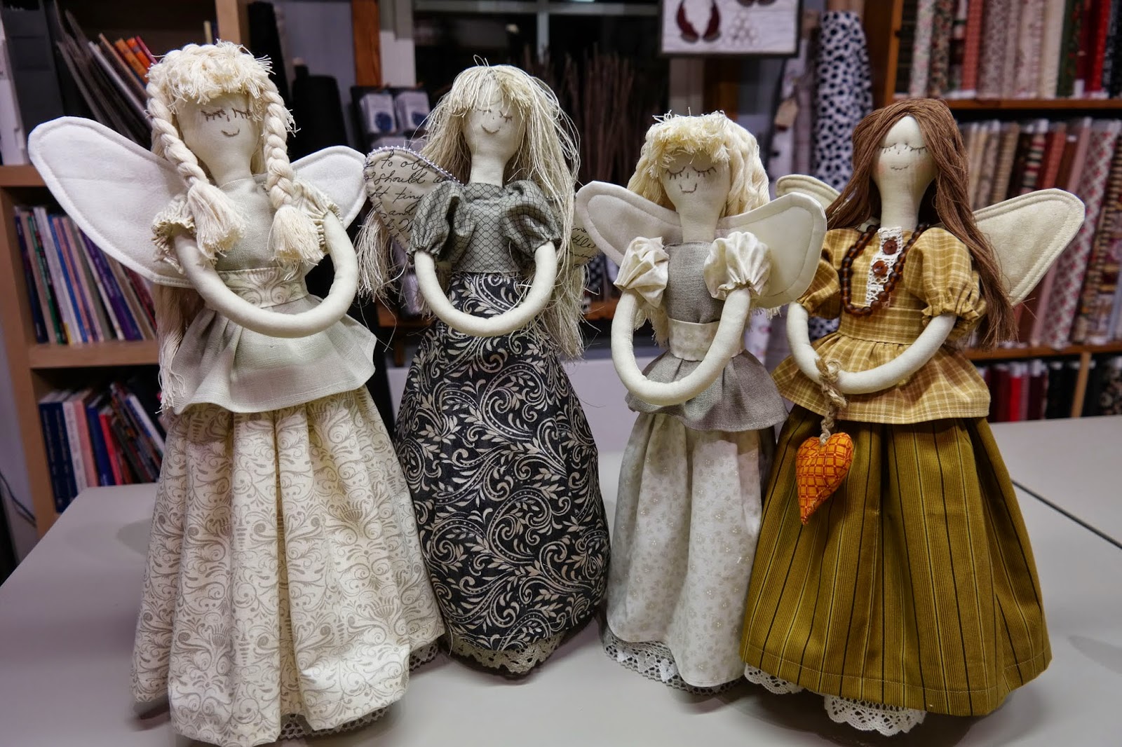 Här är en del av resultatet från Solbritt och Marias Änglakurs, fyra (nästan) färdiga läckra änglar. Sömmerskorna bakom dessa heter Karin Johansson, AnnMari Kullgren, Ann-Christine Hultkvist och Birgit Welandson.