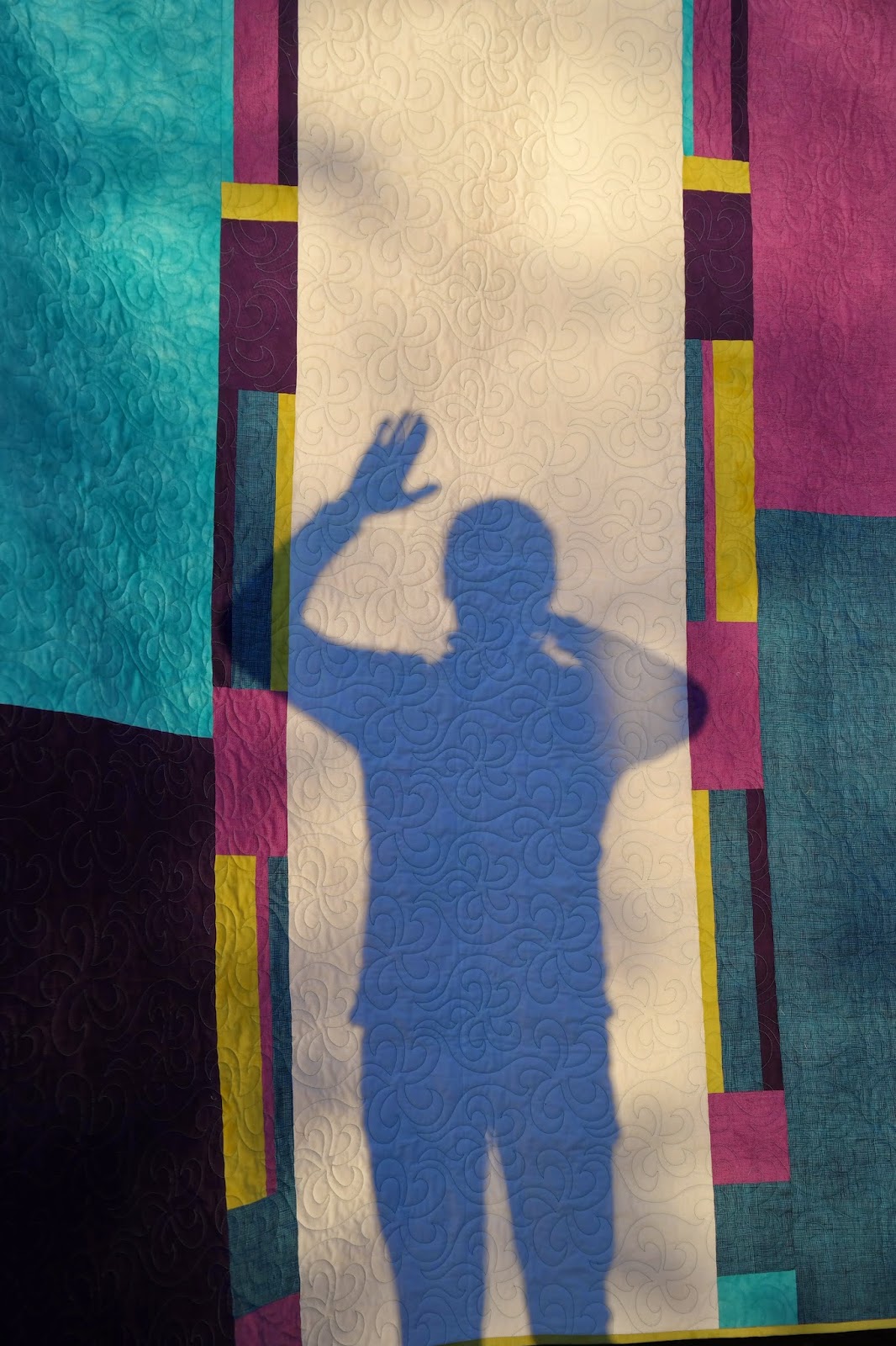 Kvilten på bilden är en baksida av en ännu läckrare framsida som vi både kommer att sälja linjal, mönster och kurs till. Skuggan på kviltens baksida är mannen i fullt solljus som lycklig som en lärka kunde visa hustrun att det blir alldeles förträffliga bilder i solljus.