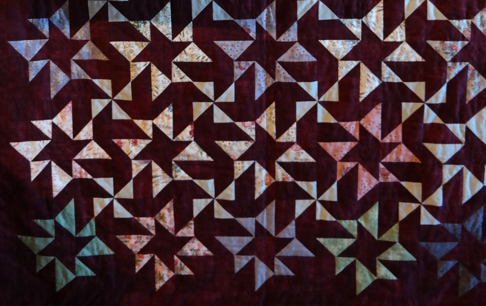 Tygerna räcker till en kvilt som blir ca 140 x 206 cm (korrigerat 160809) men den kan lätt göras större med kanter och lite andra tricks.