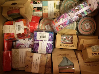 Nu har vi en stunds jobb med uppackning och prismärkning men det känns bara jättekul. Fördelen med att handla så här är att man kan köpa det man vet att man behöver här och nu och inte ett halvår fram i tiden. Man ser varorna och kan känna på dem och inte bara som små tygprover eller som i många fall papperskopior. Andra fördelar är att man kan köpa en liten upplaga av många olika sorter istället för en stor upplaga av några få serier. Det är alltså ganska många Charm Packs, Candys och Layer Cakes som vi fått hem så få av, att det inte är lönt att lägga ut dem i webbshopen.