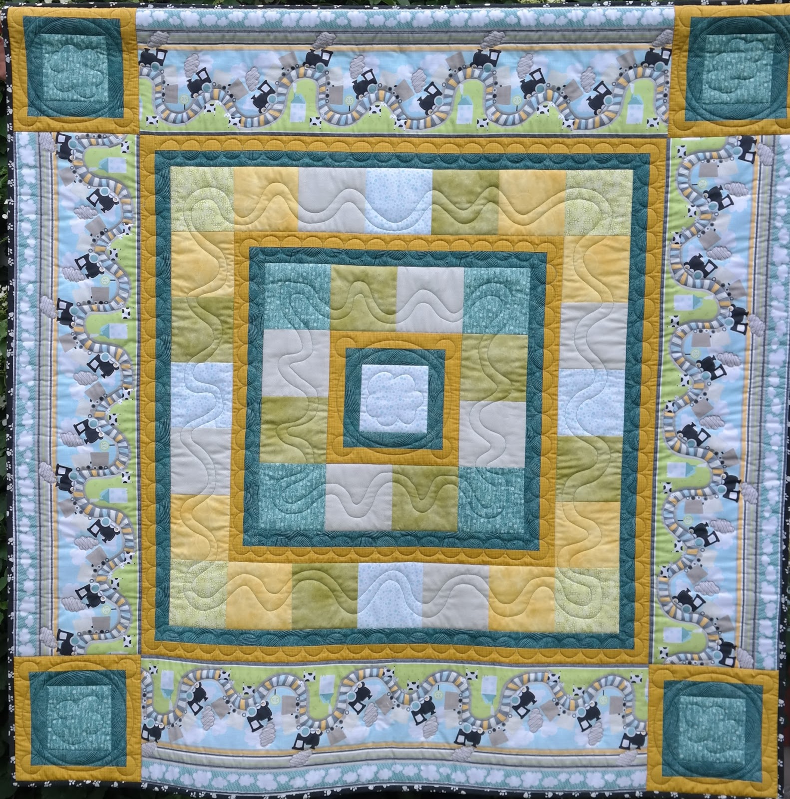 För nåt år sedan blev vi inspirerade av ett bårdtyg med dinosaurer och gjorde ett mönster utifrån det. Mönstret kallade vi enkel krypkvilt. Nu har vi slut på dinosaurer och istället har det kommit ett annat bårdtyg med tåg och såklart funkar det att byta tyger och få ett helt annat täcke. Gunilla Persson i Ätran vågade anta utmaningen att testa och så här fint blev resultatet. Vi har packat tyger till hela framsidan och de hittar du här.