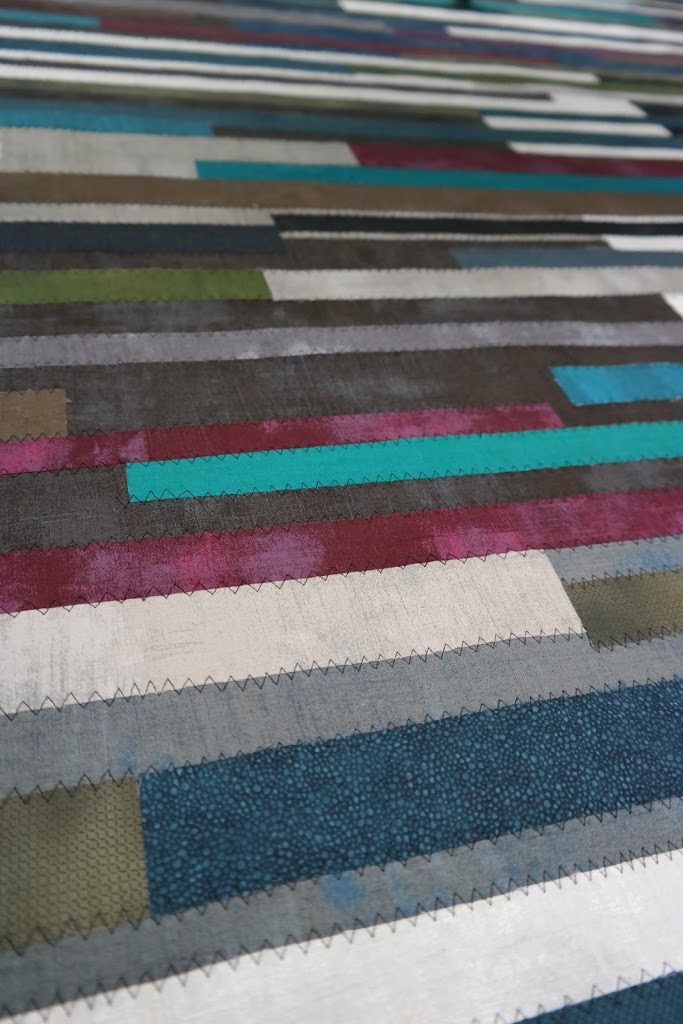 Sen har jag ”vliesofixat” fast olika ganska stora tygsjok av Modas Grunge i blandade färger och uppepå det strök jag fast remsor i olika längd och bredd.