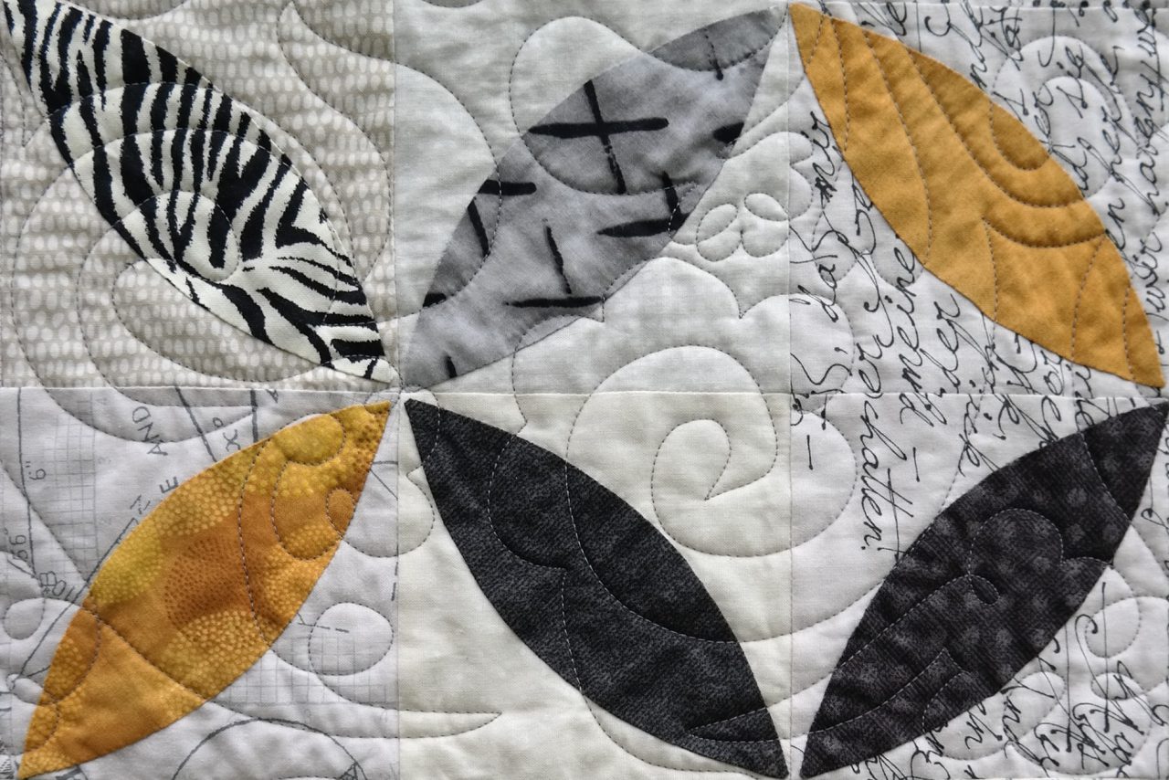 Kvilten är sydd med applikationer som jag sytt både för hand och på maskin och det är svårt att med blotta ögat urskilja vilka som är vilket.